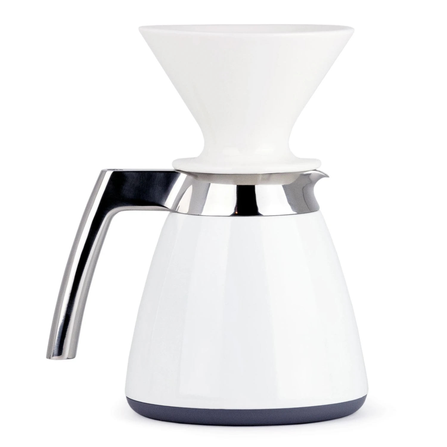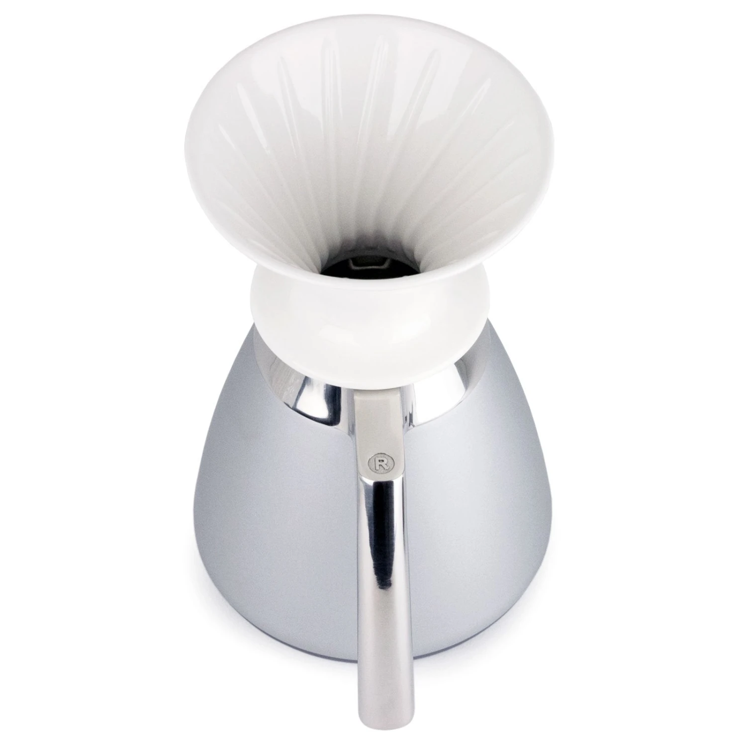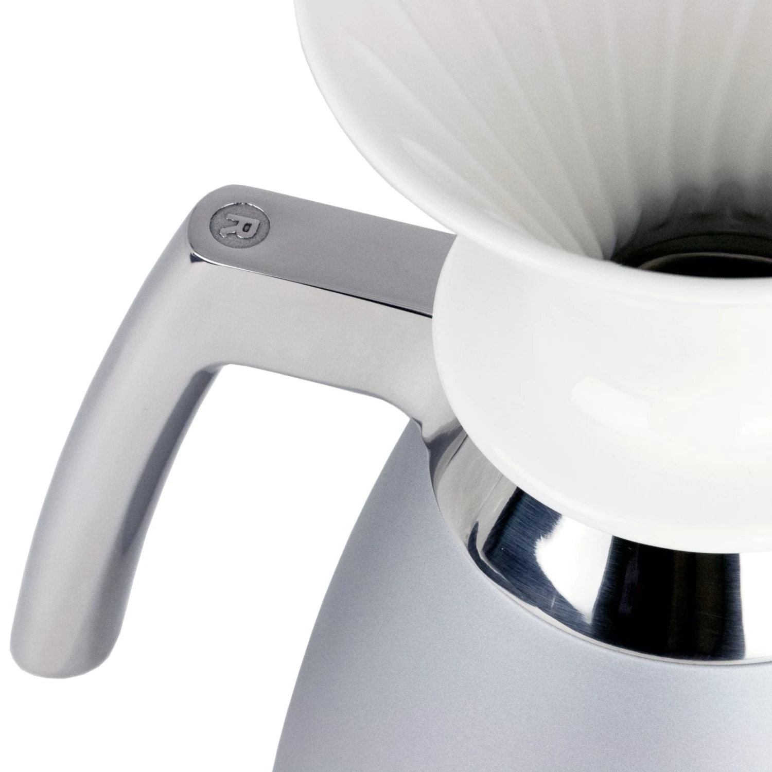 With the Ratio Thermal Carafe and Porcelain Dripper, you can brew delicious batches of coffee and keep them hot for hours. Available in multiple finishes to match your Ratio Eight Coffee Maker, the thermal carafe is made with 18/8 stainless steel and the handle is made of solid, polished 304 stainless steel.