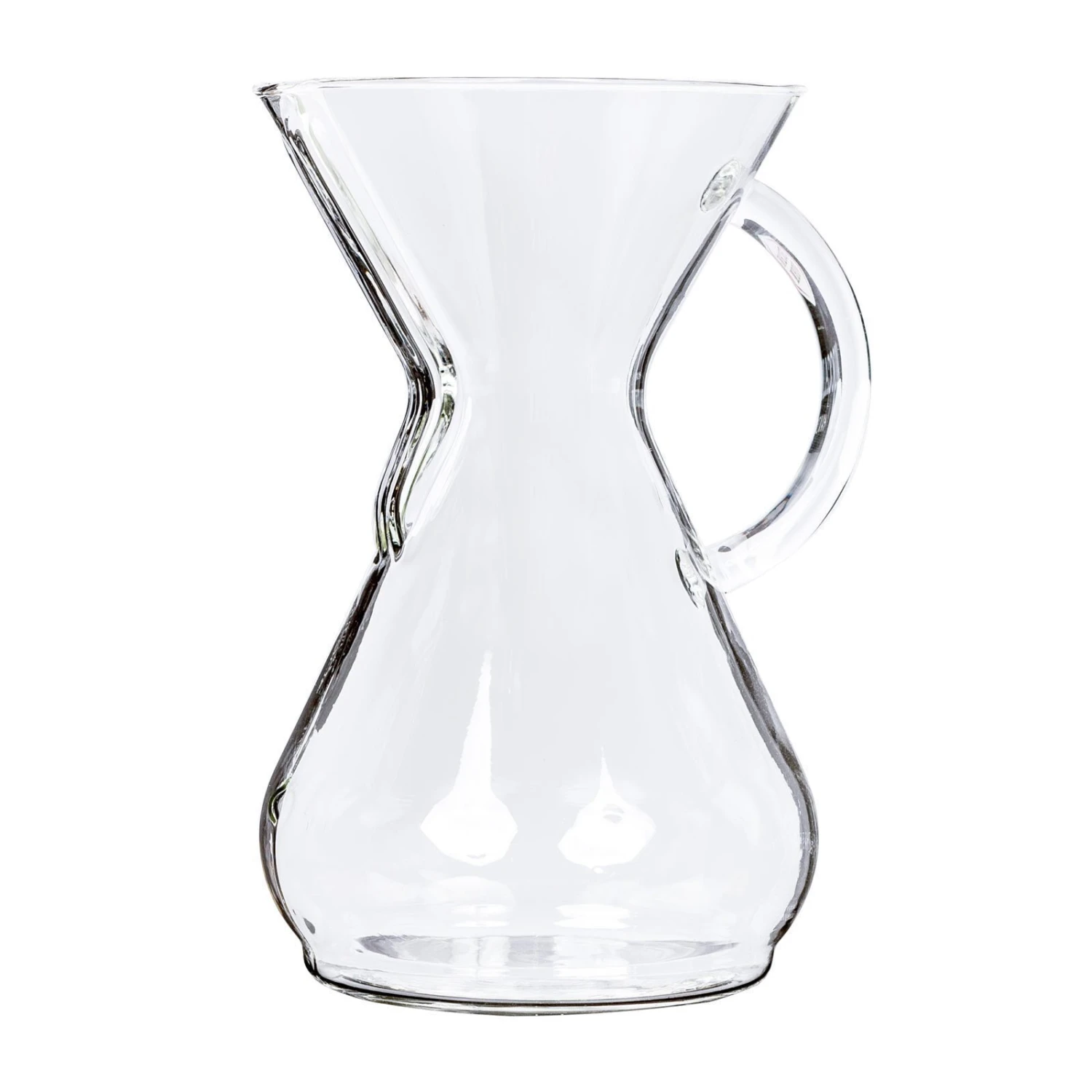 This eight cup glass handle coffeemaker includes a heat resistant, hand blown hourglass carafe with a loop handle for effortless pouring. Dishwasher safe and holds up to 40 oz. Chemex filters sold separately.