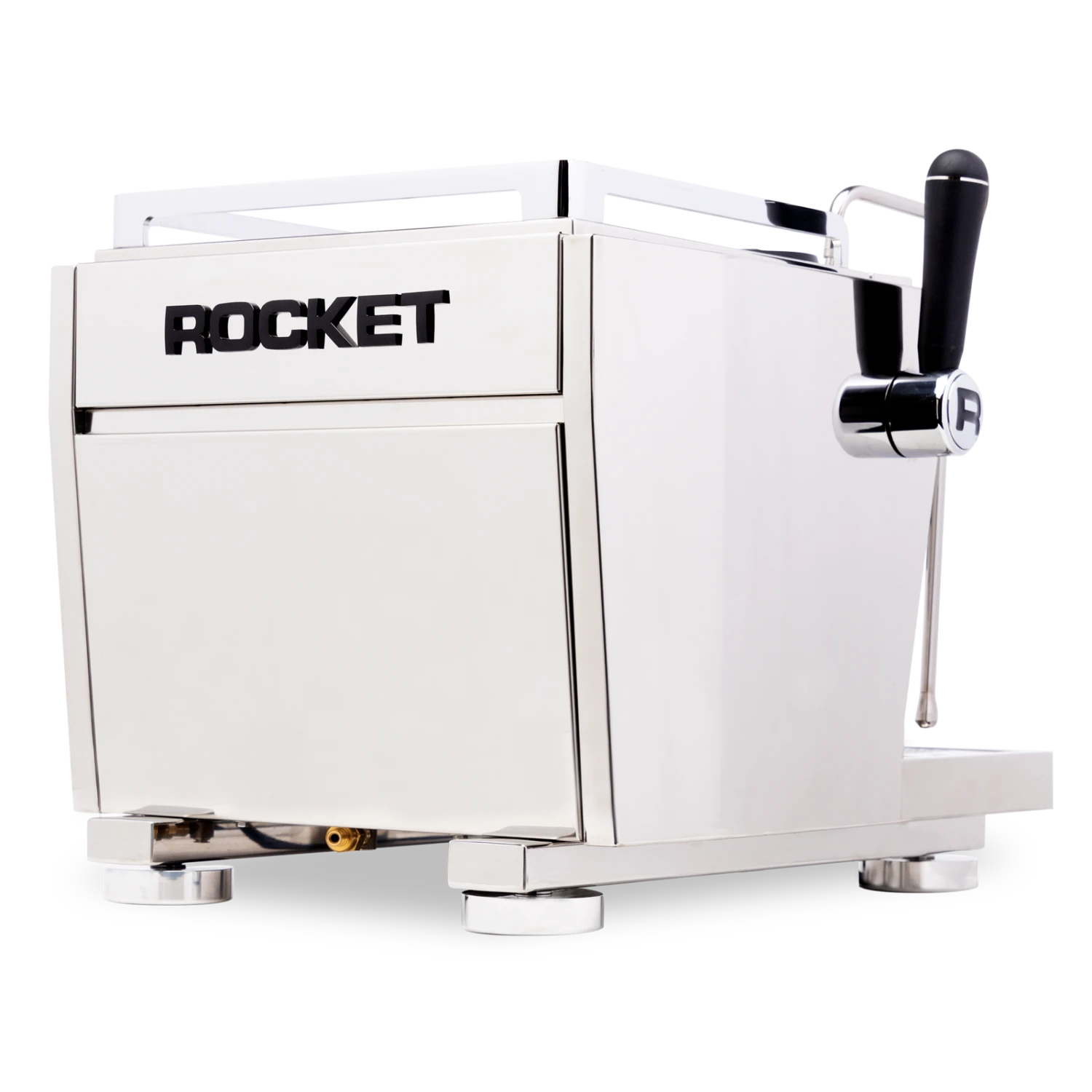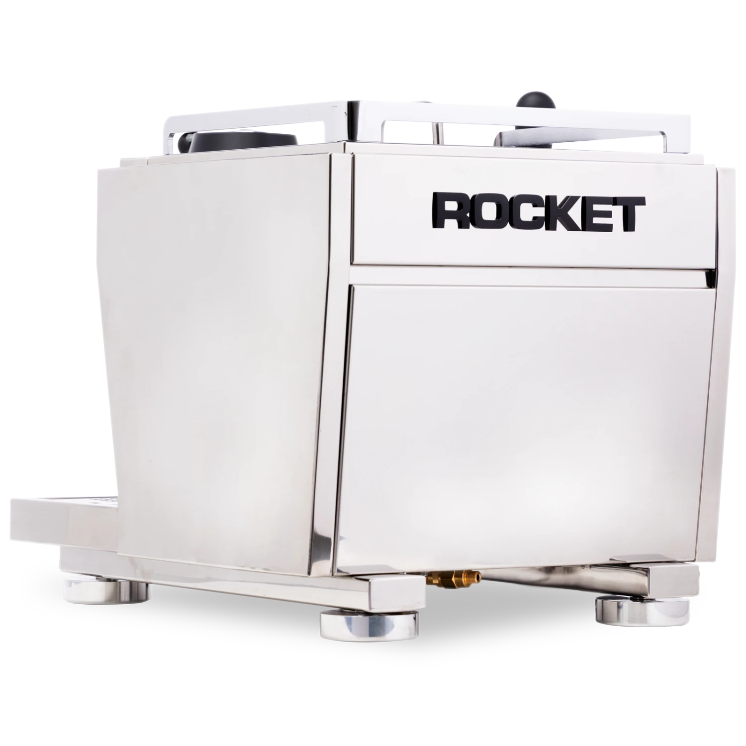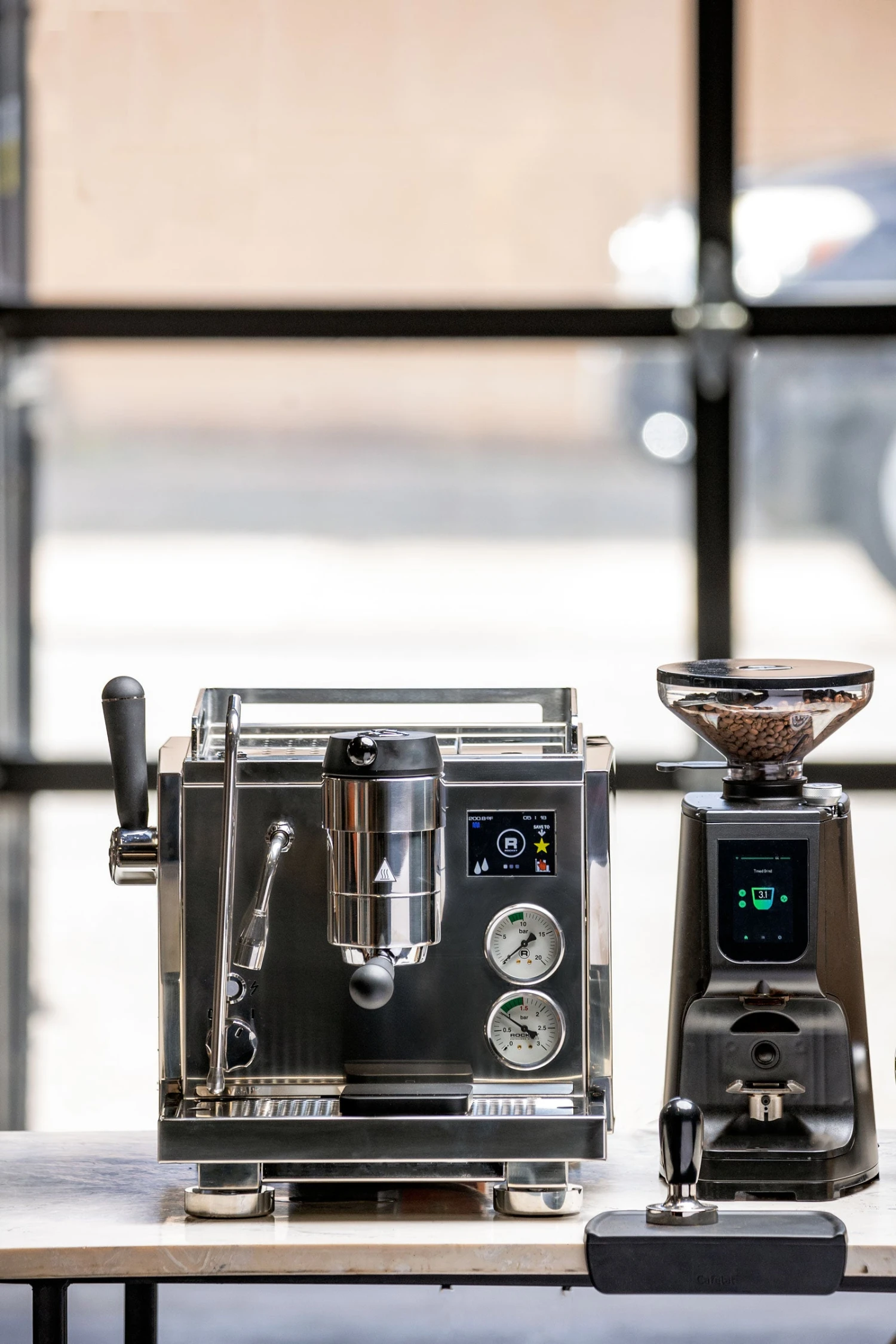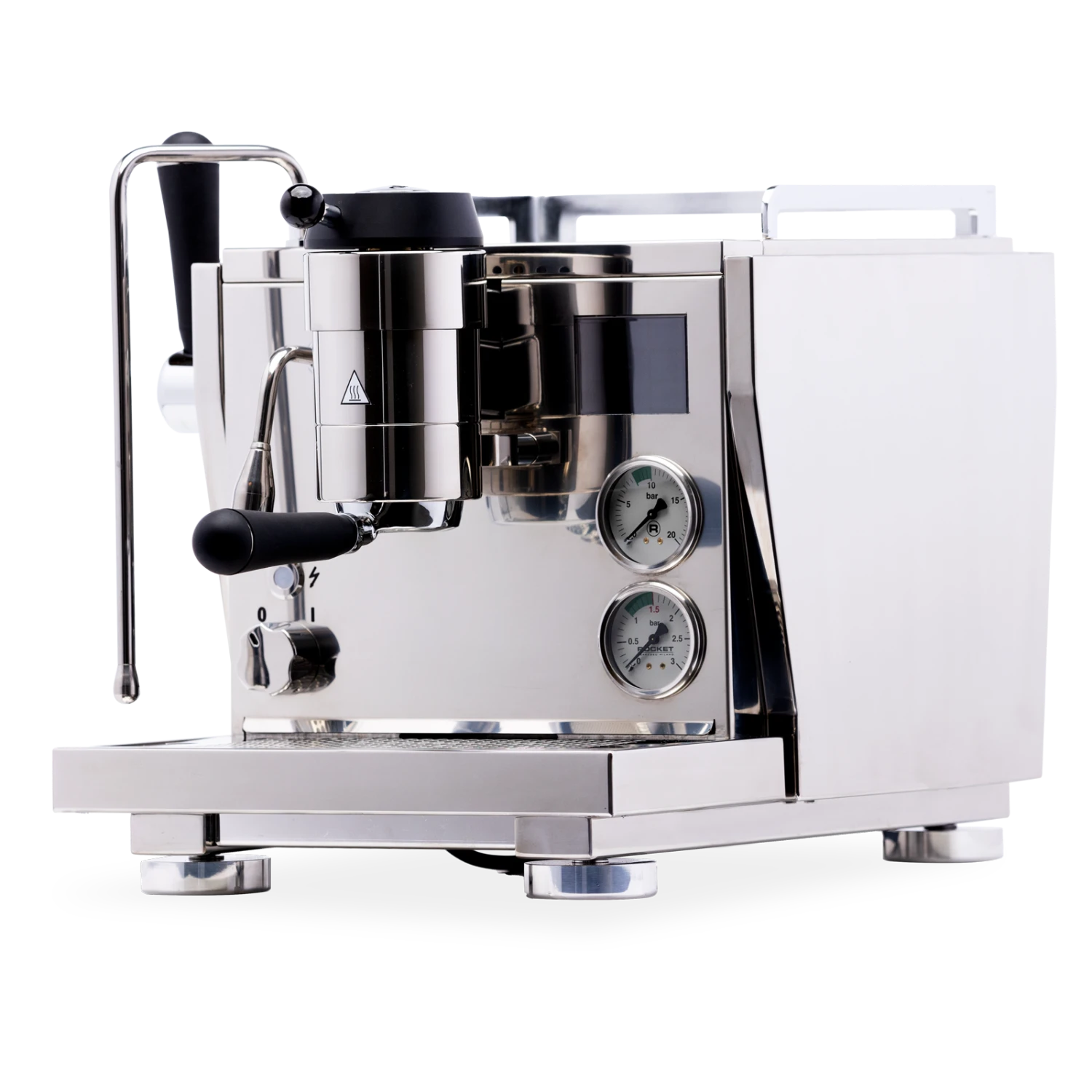 The Rocket R Nine One is a dual boiler espresso machine with a saturated group head, PID temperature control, shot timer, and a rotary pump that can be direct plumbed or run on its internal reservoir. It features manual and programmable pressure profiling, allowing you to save up to 5 coffee recipes via the control knob or the color touchscreen.